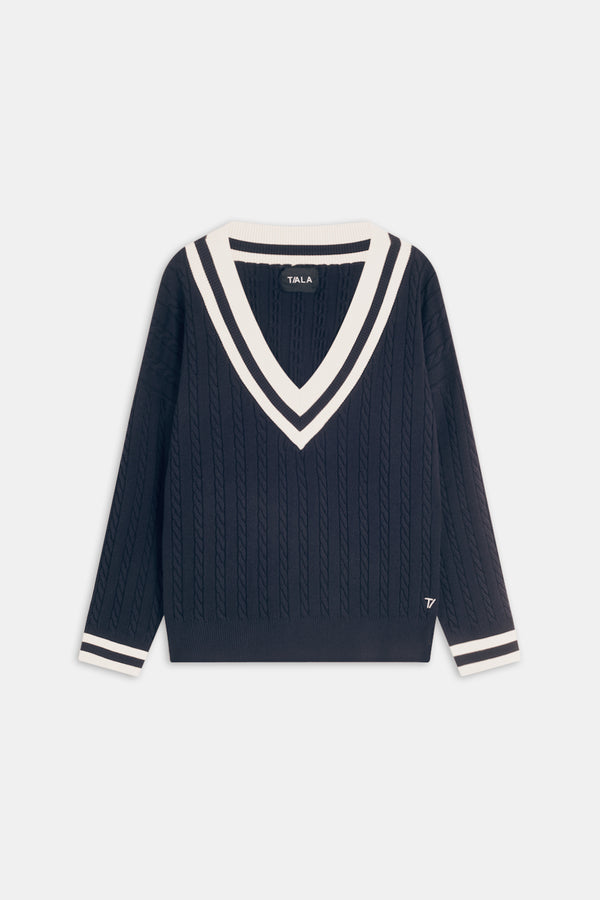 Oversized V Neck Knitted Cricket Jumper – Midnight Navy / Ivory